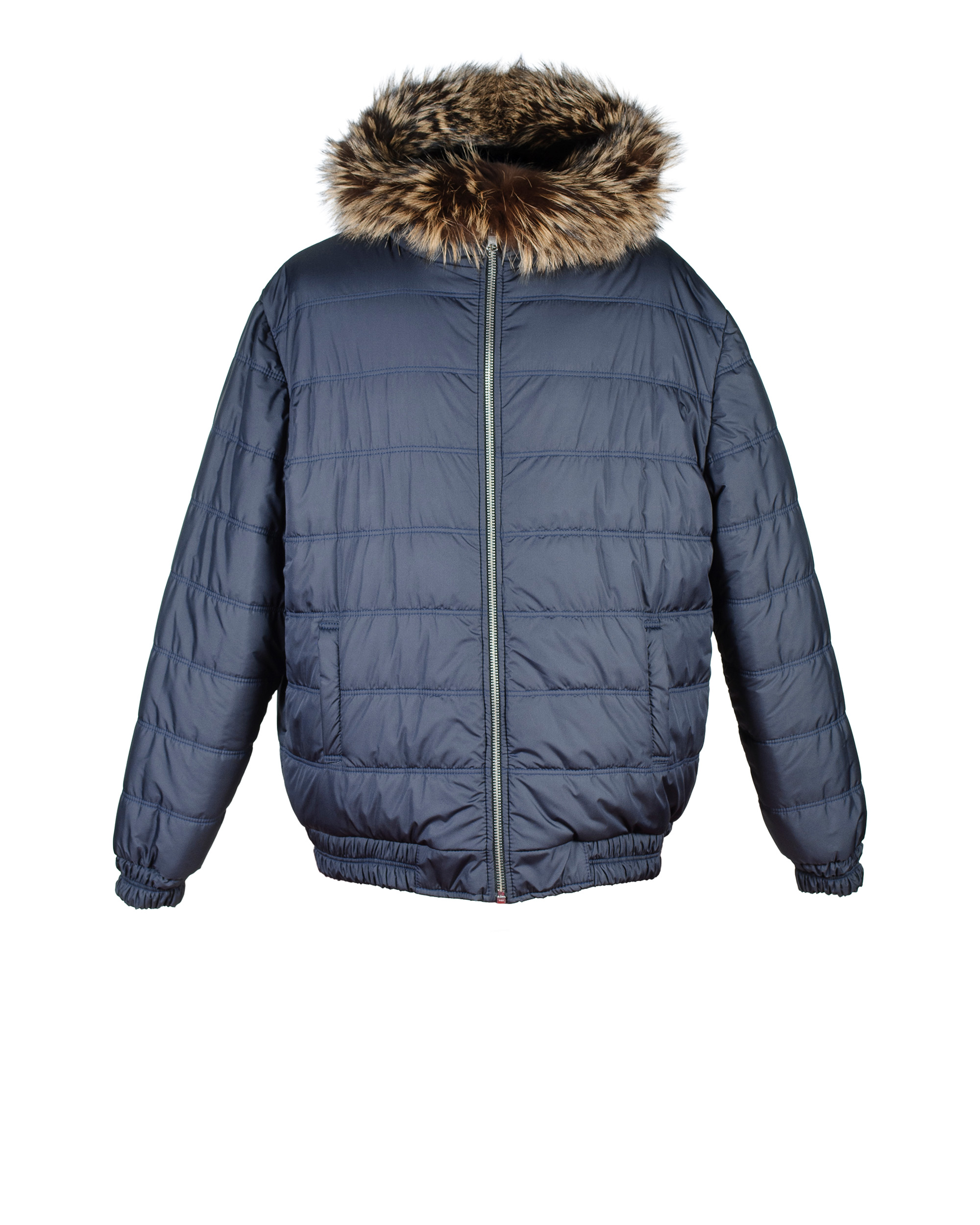 Navy puffer with raccoon fur hood.